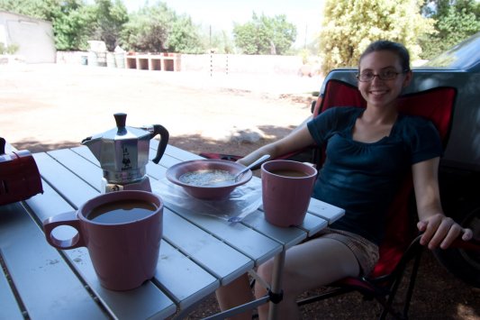 After some trouble getting US dollars from the HSBC, we drove the 20km to San Carlos and found the campground with no problems. We made coffee in the Bialetti and Katie had oatmeal as it had been a few hours since breakfast. We sunscreened up and walked the 1 minute to the ocean – waterfront that we had all to ourselves. (It seems that tourism is at a big low in Mexico at the moment. Maybe it’s not the season for it, maybe it’s Mexico’s bad rep.)