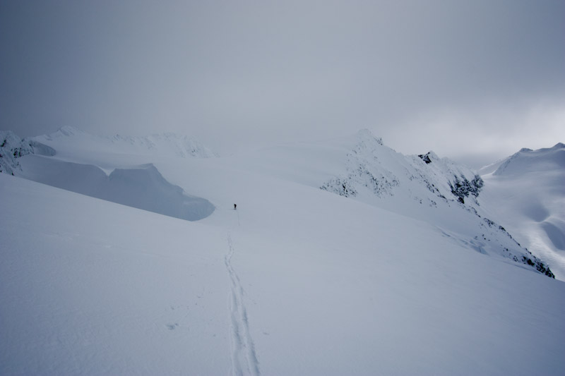 By 2:17pm things were socking in. I was starting to worry about what might happen if we got stuck out. I had made the mistake of forgetting my shell. A fleece and lightweight down jacket would have made for a pretty cold night if we got stuck in a storm.