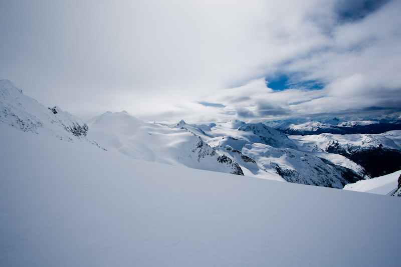 There were loads of skiers for a Wednesday morning. Perhaps everyone had been keeping tabs on the weather forecast. We were at the top of the Blackcomb Glacier by 10:40am with a great view of the terrain to come.