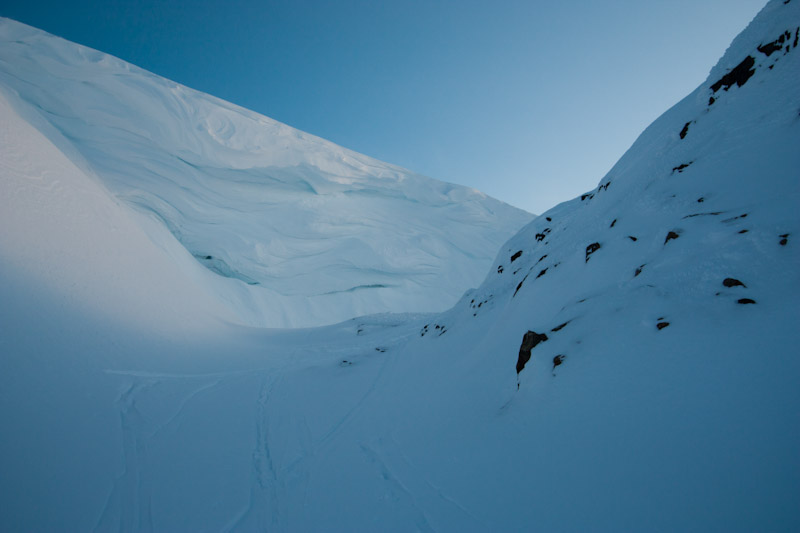 We passed some slack-country skiers who intended to ski “The Hourglass”, a pretty crazy looking run on Tremor Mountain. Time to check the GPS again to get our bearings.