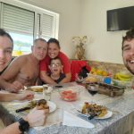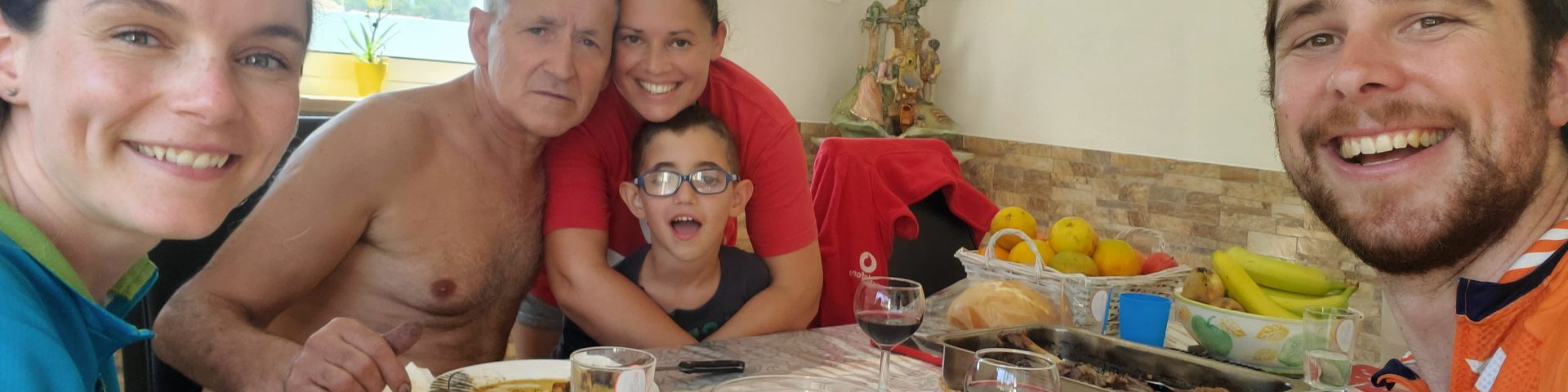 Unfortunately it was not to be, and after a few km I got another flat, and the tire tore completely in one section. We called the three bike shops in the town 13km away (Figgeres do Foz), but no one answered. There was one house right where the tire blew so we rang the doorbell and met Toni, his wife Marlin, and their five year old son Leonardo. They graciously invited us in for lunch (slow cooked wild boar [Javali], potatoes, and tomatoes they grew in their garden) along with wine and some harsh liquor distilled from grapes. Toni called around to many people and eventually reached a friend who’s wife worked in the bike shop that wasn’t answering their phone. He drove me in the 13km to get a new tire (€20), we fixed it at his house (he’s a car mechanic and has an air compressor we used to fill the air up).