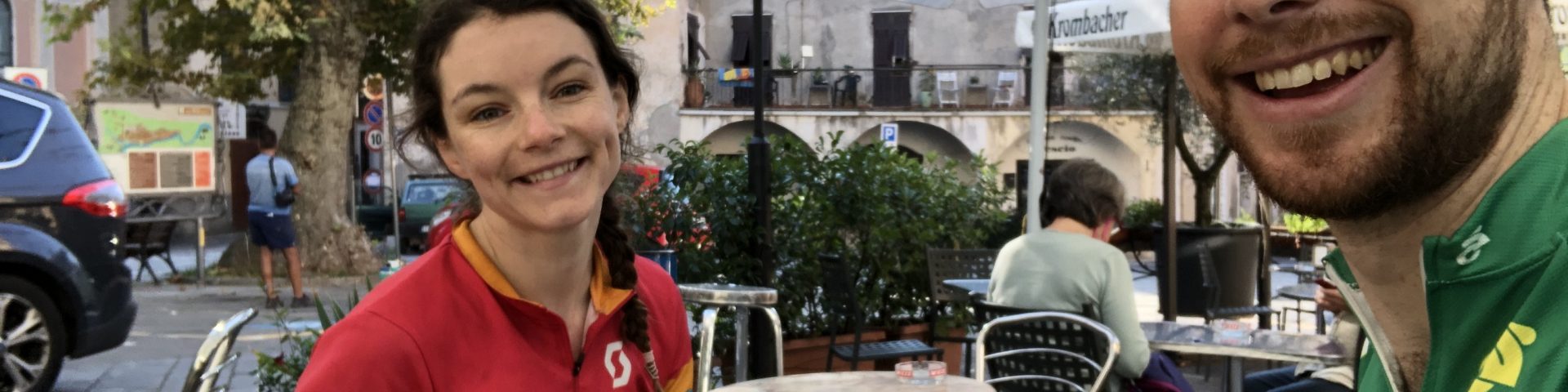 We set off by 7:50am continuing on our climb, in search of coffee and pastries. The first two “towns” that we got to were tiny and didn’t have a coffee shop. We flagged down some old Italian men who were also cycling in one small village, who advised us to carry on to Pieve di Teco, 8km, and offered to escort us. Fortunately it was all downhill and we quickly arrived. It was a quaint old town, where we found a bar with coffee and chocolate croissants (only 1EUR per coffee and 1EUR per croissant, which seems to be the norm in northern Italy). Since there was no supermarket, we went to a small deli, where I was able to buy bread, some meat “speck” sliced fresh, and some pecorino cheese.
