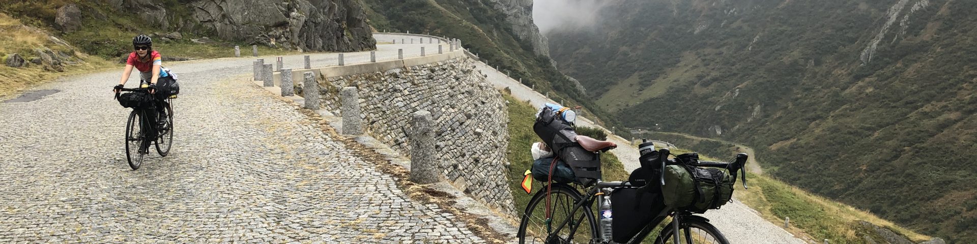 We arrived at Airolo around 11:30, exhausted, and had a big lunch. I bought a pack of 20 cookies, so every 100m of ascent up the pass, we’d each have a cookie. Slowly but surely we made it up the path, nearly all cobblestone for 1000m! It was very uncomfortable. We climbed into the clouds, where it drizzled and we lost all visibility.